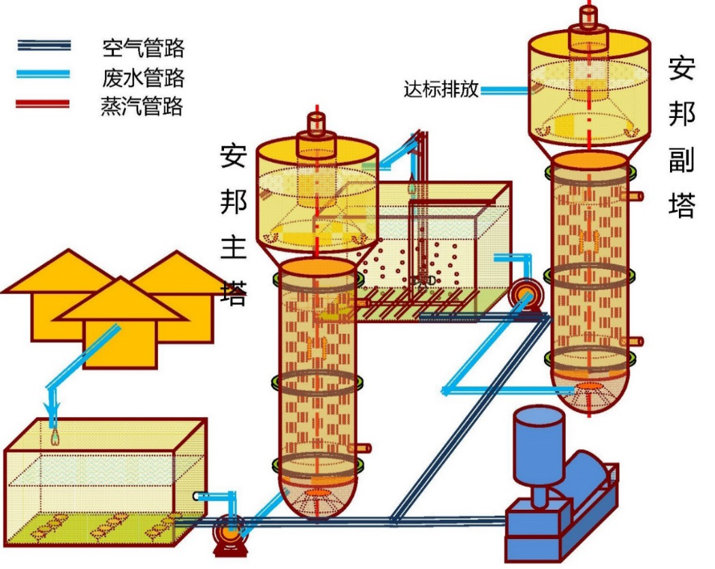 在安邦(bāng)脫氮工藝中,主塔和副塔串聯。主塔采用“快生型”脫氮菌,可快(kuài)速去除(chú)廢水中的硝酸鹽(yán),實現高負荷,副塔采用“慢(màn)生型”脫(tuō)氮菌,可確保出(chū)水達標排放。安邦係統後增加A/O生化係統作為達標保障。安邦生物脫氮技術依托安邦反應器和反硝化顆粒汙泥。顆粒汙泥濃度(dù)高達30~40 g-SS/L,小試容(róng)積負荷70kg-N/(m3·d),生產性容積負荷10kg-N/(m3·d),NO3--N去除率90%以上。